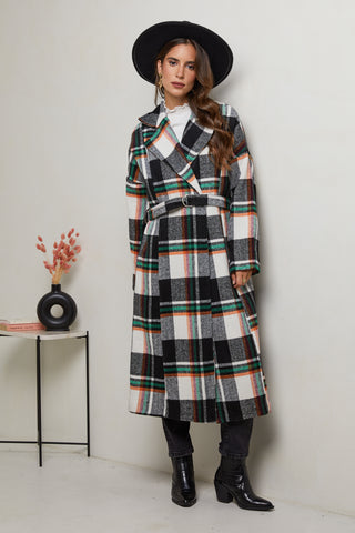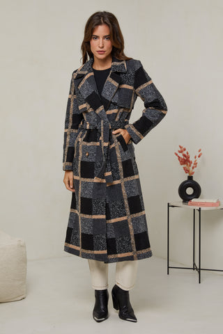 100101Manteau long à motif carreaux, col rabattu, fer...Manteau long à motif carreaux, col rabattu, fermeture à 4 boutons avec ceinture à la taille et deux poches sur les côtés€215,00