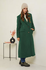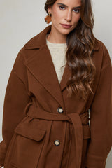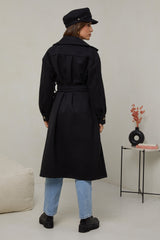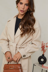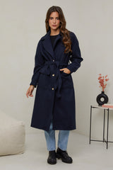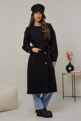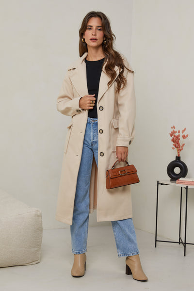Manteau long, col rabat, fermeture à trois boutons avec ceinture à la taille et deux poches à l'avant, et un détail bouton sue les poignets