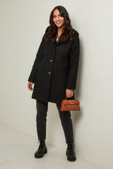 Manteau mi-long effet bouclette, à capuche, fermeture à trois boutons avec deux poches sur les cotés.