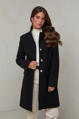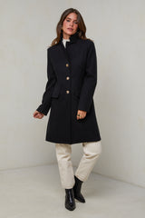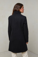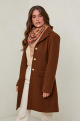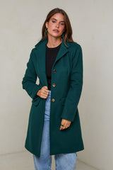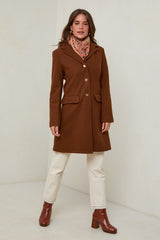 Manteau long, col rabattu, fermeture à 3 boutons, et deux poches à l'avant