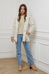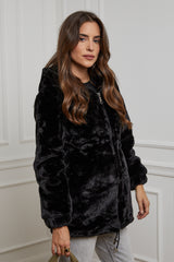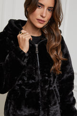 Fausse fourrure mi-long à capuche, fermeture éclaire et deux poches sur les cotés