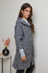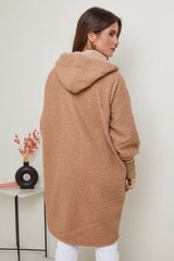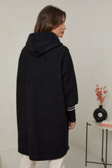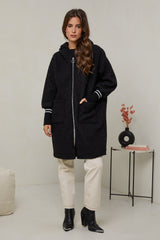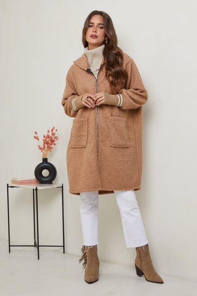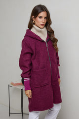 Manteau mi-long à tissu bouclette, avec capuche, fermeture éclaire avec deux poches à l'avant et un detail poignets serrés en maille