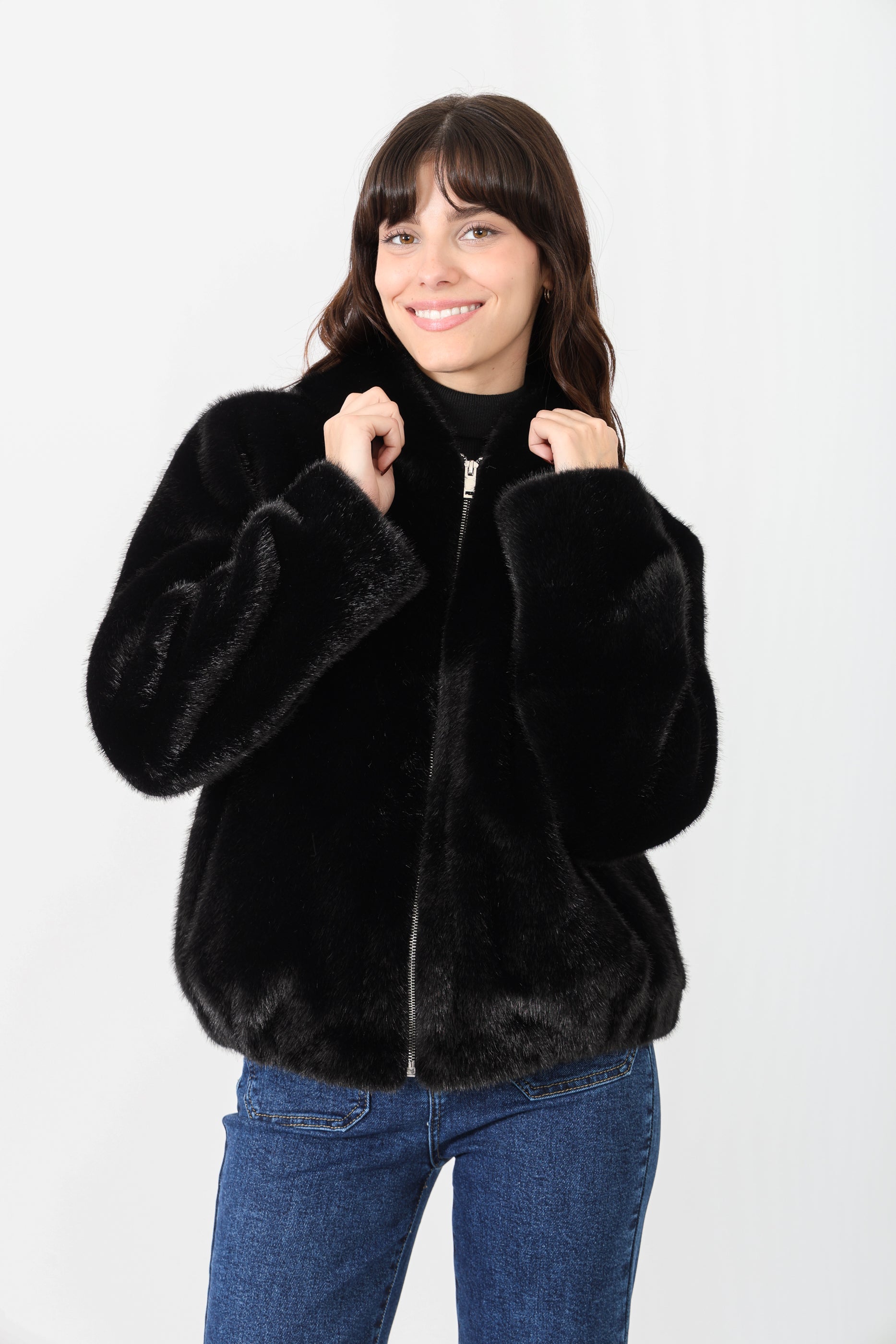 Fausse fourrure courte doublé à capuche, fermeture éclaire et deux poches sur les cotés