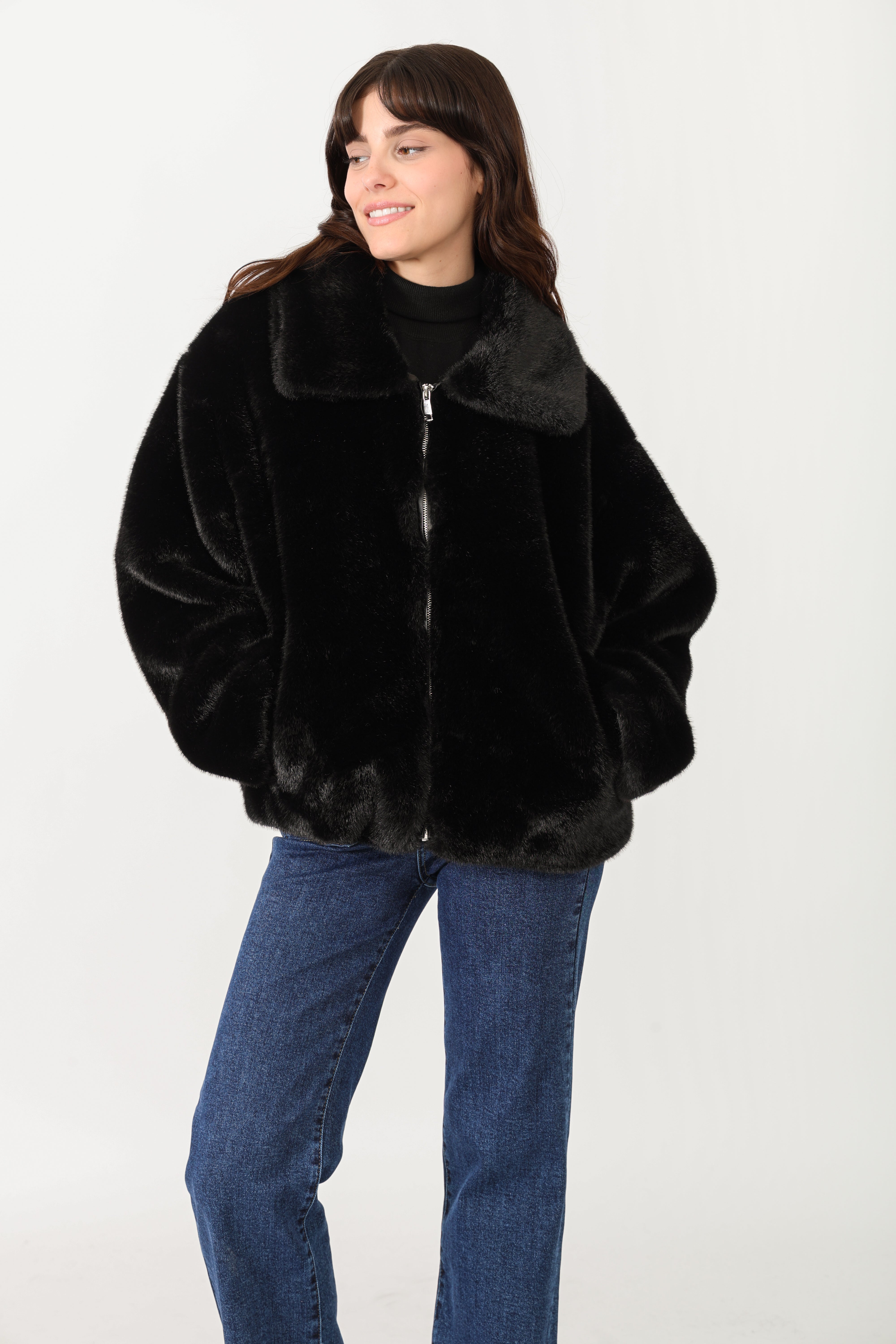 Fausse fourrure courte doublé col chemise, fermeture éclaire et deux poches sur les cotés.